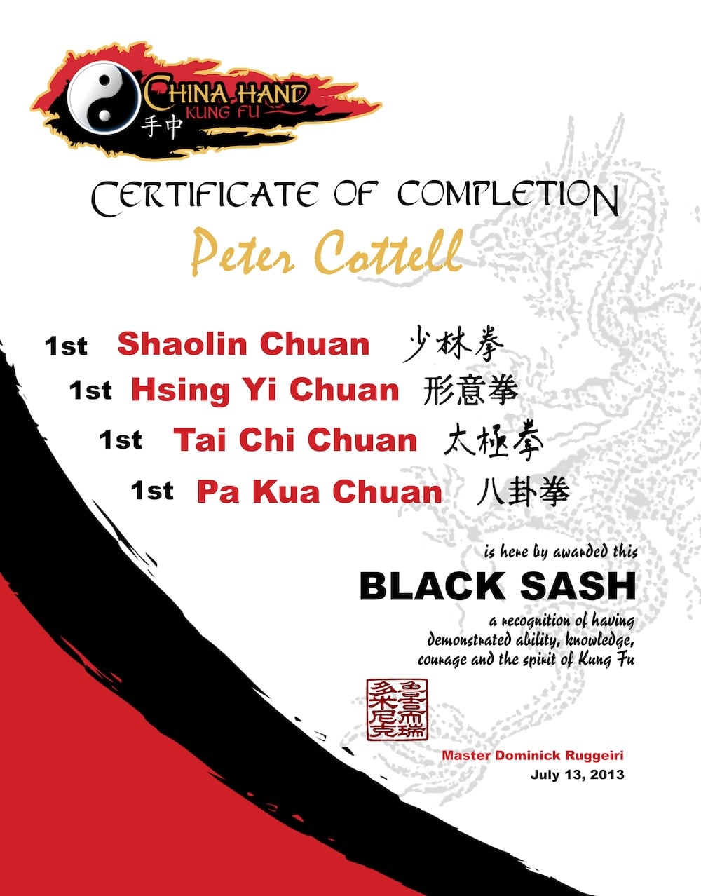 Ranks: 1st Degree Black Sash Shaolin Chuan July 13, 2013n1st Degree Black Sash Tai Chi Chuan July 13, 2013n1st Degree Black Sash Pa Kua Chuan July 13, 2013n1st Degree Black Sash Hsing Yi Chuan July 13, 2013